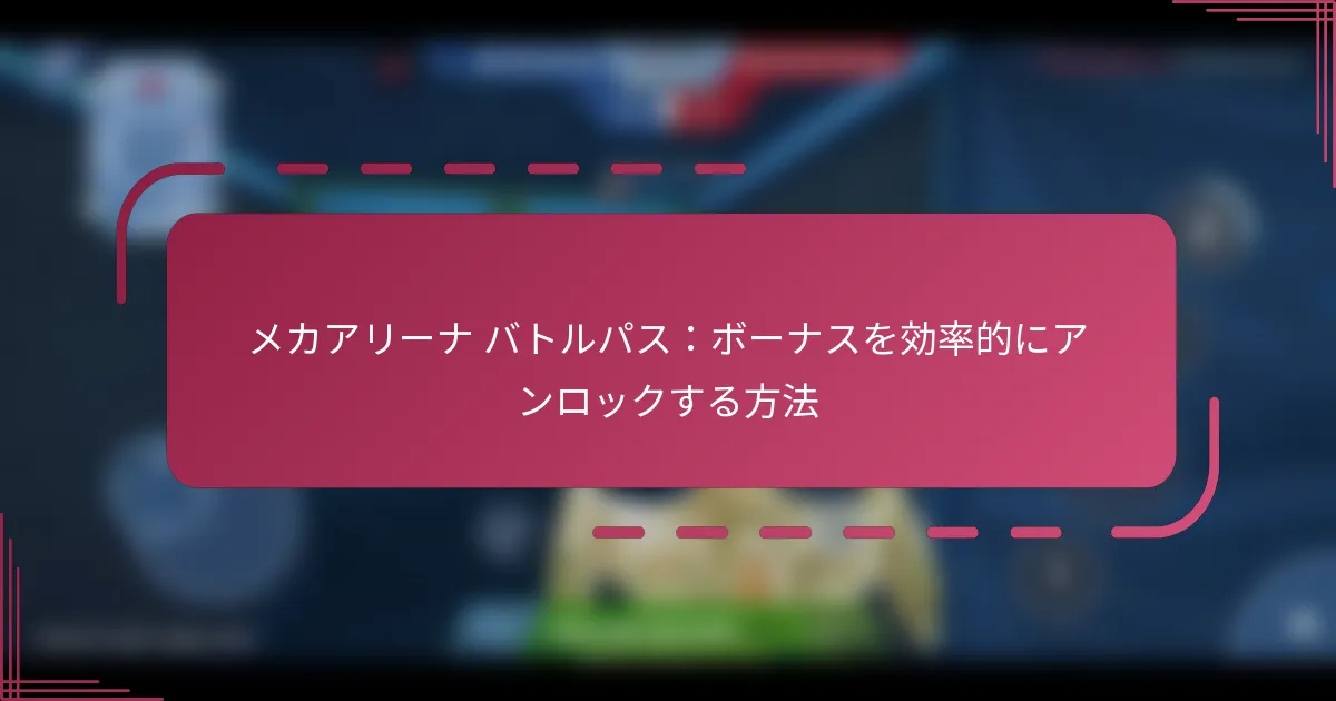 メカアリーナバトルパスは、プレイヤーがゲームプレイを通じて独自の報酬やボーナスをアンロックできる季節限定の機能です。さまざまなチャレンジやミッションをクリアすることで、プレイヤーはティアを進行し、スキン、ゲーム内通貨、特別な能力など、ゲーム体験を向上させるユニークなアイテムを獲得できます。これらのボーナスを効率的にアンロックするためには、特定のゲームプレイモードに集中し、日々のチャレンジや週次のチャレンジを完了し、チームメイトと協力して報酬を最大化することが重要です。 メカアリーナバトルパスとは? メカアリーナバトルパスは、プレイヤーがゲームプレイを通じて独自の報酬やボーナスをアンロックできる季節限定の機能です。さまざまなチャレンジやミッションをクリアすることで、プレイヤーはティアを進行し、ゲーム体験を向上させるユニークなアイテムを獲得できます。 バトルパスの定義と目的 バトルパスは、プレイヤーが報酬を得ながらゲームに参加するための構造化された方法として機能します。シーズンを通じて完了できるさまざまなチャレンジを提供することで、継続的なプレイを促進します。 その主な目的は、プレイヤーに達成感と進行感を提供し、ゲームプレイをより報酬的にすることです。このシステムは、プレイヤーがチャレンジをクリアするための戦略やヒントを話し合うことが多いため、コミュニティの関与も促進します。 メカアリーナバトルパスの主な特徴 定期的にリフレッシュされる季節限定のチャレンジ 報酬が増加する複数のティア スキンやエモートを含む独自のコスメティックアイテム 異なる参加レベルに応じた無料およびプレミアムトラック これらの特徴は、全体的なゲーム体験を向上させ、よりダイナミックで魅力的にするために設計されています。プレイヤーは、無料トラックまたはプレミアムトラックのいずれかに参加することを選択でき、プレイスタイルや投資に応じた柔軟性を提供します。 バトルパスがゲームプレイとどのように統合されているか バトルパスは、メカアリーナのコアゲームプレイにシームレスに統合されています。プレイヤーはメインメニューから直接チャレンジにアクセスでき、進行状況や目標を簡単に追跡できます。 チャレンジを完了するためには、プレイヤーがさまざまなゲームモードに参加する必要があり、ゲームの異なる側面を体験することが保証されます。この統合は、ゲームプレイを新鮮に保つだけでなく、プレイヤーが新しい戦略や戦術を探求することを促します。 利用可能な報酬の種類 バトルパスから得られる報酬は多岐にわたり、異なるプレイヤーの好みに応じています。プレイヤーは、ユニークなメカスキン、武器スキン、エモートなど、ゲーム体験を個性化するコスメティックアイテムを獲得できます。 コスメティックアイテムに加えて、プレイヤーはゲーム内通貨も受け取ることができ、これを使用して追加アイテムやアップグレードを購入できます。これらの報酬は、ゲームプレイの美的および機能的な側面を向上させるために設計されています。 バトルパスの期間とシーズン メカアリーナバトルパスは通常、数週間続き、ゲームの季節更新に合わせて調整されます。各シーズンは新しいチャレンジと報酬を導入し、プレイヤーにとってコンテンツを新鮮で魅力的に保ちます。 プレイヤーは、各シーズンの開始日と終了日を注視し、参加を最大化する必要があります。シーズンの初めに参加することで、チャレンジを完了するための十分な時間を確保し、利用可能な報酬を最大限に活用できます。 バトルパスを通じてアンロックできるボーナスは何ですか? メカアリーナのバトルパスでは、独自のスキン、ゲーム内通貨、特別な能力、イベント特有の報酬など、さまざまなボーナスを提供しています。プレイヤーは、これらのアンロック可能なアイテムを通じてゲームプレイ体験を向上させ、メカをカスタマイズできます。これらのアイテムは、各シーズンの限られた期間のみ利用可能です。 独自のアイテムとスキン バトルパスは、通常のゲームプレイでは入手できない独自のアイテムやスキンへのアクセスを提供します。これらのユニークなコスメティックは、プレイヤーがメカを個性化し、戦闘で目立つことを可能にします。季節のテーマは、これらのスキンのデザインに影響を与えることが多く、ゲームに新鮮な美的要素を加えます。 報酬を最大化するためには、スキンのアンロックを特に言及しているバトルパスチャレンジを完了することに集中してください。これにより、これらの独自のアイテムを効率的に取得するための進行が保証されます。いくつかのスキンは限られた期間のみ利用可能であるため、プレイスタイルに応じて優先順位を付けてください。 ゲーム内通貨の報酬 プレイヤーはバトルパスを通じてゲーム内通貨を獲得でき、これを使用してア