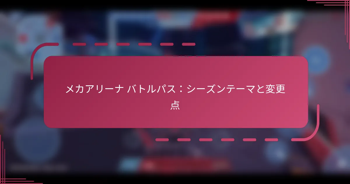 メカアリーナバトルパスは、ゲーム内のチャレンジや独占報酬を提供することでプレイヤーのエンゲージメントを高める季節ごとの機能です。各シーズンは、メカやスキンのデザインに影響を与えるユニークなテーマを導入し、全体的なゲーム体験を豊かにします。今シーズンは、新しいテーマ、価格の調整、コミュニティのフィードバックに基づいた更新された報酬構造を含む重要な変更がもたらされます。 メカアリーナバトルパスとは何か、その目的は? メカアリーナバトルパスは、プレイヤーのエンゲージメントを高め、さまざまなゲーム内チャレンジや報酬を通じて参加を報いるために設計された季節ごとの機能です。プレイヤーがゲームをプレイしながら独占アイテム、通貨、その他の特典を獲得するための構造化された方法を提供します。 メカアリーナにおけるバトルパスの定義 メカアリーナのバトルパスは、プレイヤーがシーズン中に特定のチャレンジを完了することで報酬をアンロックできる階層システムです。各シーズンは通常数週間続き、プレイヤーが階層を進むための十分な時間を提供します。プレイヤーは無料版とプレミアム版のいずれかを選択でき、後者は追加の報酬を提供します。 プレミアムバトルパスは通常、少額のゲーム内通貨または実際のお金で購入でき、通常のゲームプレイでは入手できない独占スキン、武器、その他の強化にアクセスできます。これにより、プレイヤーはゲームにより深く関与し、チャレンジを完了することが奨励されます。 バトルパスがゲームプレイ体験を向上させる方法 バトルパスは、プレイヤーにシーズン中に達成すべき明確な目標と目的を提供することで、ゲームプレイ体験を向上させます。この構造化されたアプローチは、プレイヤーが定期的に関与し、ゲームのさまざまな側面を探求することを奨励します。チャレンジを完了することで、達成感や進行感を得ることができます。 さらに、バトルパスを通じて提供される独占報酬は、プレイヤーがゲームに時間を投資する動機となります。プレイヤーは、新しいスキンやアップグレードをアンロックすることで、ゲームプレイが向上するだけでなく、メカのパーソナライズが可能になることをしばしば実感します。 バトルパスの構造と階層の概要 バトルパスは複数の階層に分かれており、各階層はプレイヤーが特定のタスクやチャレンジを完了することで進む必要があります。通常、シーズンには約30から50の階層があり、各階層はユニークな報酬を提供します。プレイヤーは、試合から経験値を獲得し、日々または週ごとのチャレンジを完了することでこれらの階層を進むことができます。 プレイヤーが進むにつれて、ゲーム内通貨、メカのスキン、武器のアップグレードなど、ますます価値のある報酬をアンロックします。階層構造は、報酬がより魅力的になるにつれてプレイヤーがシーズンを通じて関与し続けることを奨励します。 バトルパスに参加することの利点 バトルパスに参加することで、ゲームプレイを向上させる独占報酬にアクセスできるなど、いくつかの利点があります。プレイヤーは、通常のプレイでは入手できないユニークなスキンやアップグレードを獲得でき、メカのカスタマイズがより可能になります。 さらに、構造化されたチャレンジは、プレイヤーがスキルを向上させ、さまざまなゲームモードを探求することを奨励します。これにより、プレイヤーは進行感や達成感を感じることができ、より楽しく報われるゲーム体験につながります。 バトルパスに関する一般的な誤解 一般的な誤解の一つは、バトルパスが単なるペイ・トゥ・ウィン機能であるということです。プレミアム版は追加の報酬を提供しますが、プレイヤーはチャレンジを完了することで無料版でも重要な利益を得ることができます。これは、スキルと献身が金銭を使わずに貴重な報酬につながることを意味します。 もう一つの誤解は、バトルパスが過度に時間を消費するということです。実際には、プレイヤーは自分のペースで進むことができ、多くのチャレンジは通常のゲームプレイ中に自然に完了できます。この柔軟性により、プレイヤーはバトルパスを急ぐことなくゲームを楽しむことができます。 バトルパスの季節テーマは何ですか? メカアリーナのバトルパスの季節テーマは、プレイヤーにユニークな美学とゲームプレイ要素を提供し、各シーズンごとに変化します。これらのテーマは、メカ、スキン、報酬のデザインに影響を与え、全体的なゲーム体験を向上させます。 メカアリーナの季節テーマの概要 メカアリーナの季節テーマは、新しいビジュアルスタイルやゲームプレイメカニクスを導入することで、ゲームを新鮮で魅力的に保つように設計されています。各シーズンは通常数ヶ月続き、プレイヤーがバトルパスを通じて獲得できる報酬に影響を与える独特のテーマを特徴としています。 テ