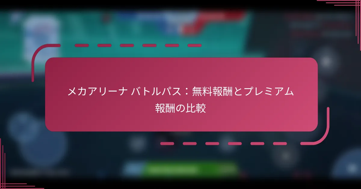 メカアリーナバトルパスは、プレイヤーに無料とプレミアムの2つの異なる報酬層を提供します。無料パスは基本的なアイテムを提供しますが、プレミアム版は独占的な報酬やボーナスでゲームプレイを大幅に向上させ、熱心なプレイヤーにとって魅力的な選択肢となります。これらの層の違いを理解することは、プレイヤーの進行やゲーム全体の戦略に大きな影響を与えることができます。 メカアリーナバトルパスにはどのような報酬が含まれていますか? メカアリーナバトルパスは、ゲームプレイやカスタマイズオプションを向上させるさまざまな報酬を提供します。プレイヤーは、無料とプレミアムの層の中から選択でき、それぞれユニークなアイテムや特典を提供します。 バトルパスの無料報酬の概要 メカアリーナバトルパスの無料報酬には、プレイヤーがお金を使わずに進行するのを助けるさまざまなゲーム内アイテムが含まれています。これらの報酬は通常、クレジットや標準スキンなどの基本的なリソースで構成されています。 アップグレード用のゲーム内クレジット 標準メカスキン 基本的な武器アップグレード 経験値ブースト 無料報酬は便利ですが、プレミアムオプションと同じレベルのカスタマイズや進行を提供しない場合があります。プレイヤーはお金を使わずにしっかりとしたゲーム体験を楽しむことができますが、バラエティは限られています。 バトルパスのプレミアム報酬の概要 プレミアム報酬は、より広範なアイテムの選択肢を提供し、全体的なゲームプレイ体験を向上させます。プレミアムバトルパスを選択したプレイヤーは、無料層では利用できない独占的なコンテンツにアクセスできます。 独占的なメカスキン 特別な能力を持つユニークなキャラクター 高度な武器アップグレード 増加した経験値 プレミアムバトルパスに投資することで、これらの独占アイテムをアンロックするだけでなく、ゲームを通じての進行も加速します。これは、パフォーマンスを向上させたい競技プレイヤーにとって特に有益です。 無料報酬とプレミアム報酬のアイテムタイプの比較 アイテムタイプ 無料報酬 プレミアム報酬 スキン 標準スキン 独占的でユニークなスキン キャラクター 基本キャラクター 特別な能力を持つキャラクター アップグレード 基本的なアップグレード 高度なアップグレード 経験値ブースト 限られたブースト 大幅なブースト この比較は、各層を通じて利用可能なアイテムタイプの違いを強調しています。プレミアム報酬は、プレイヤーにより強力なオプションとユニークなカスタマイズ機能を提供し、熱心なゲーマーにとってより魅力的です。 無料報酬とプレミアム報酬のゲーム内通貨の違い ゲーム内通貨は、メカアリーナバトルパスの重要な側面であり、プレイヤーがアイテムを取得する方法に影響を与えます。無料報酬は通常、基本的なアップグレードや購入に使用できる控えめな量のクレジットを提供します。 一方、プレミアム報酬は、プレイヤーが高度なアップグレードや独占アイテムにより容易に投資できるように、はるかに多くの通貨を提供します。この違いは、プレイヤーがゲームで効果的に競争する能力に影響を与える可能性があります。 プレミアムバトルパスの独占スキンとキャラクター プレミアムバトルパスの主な魅力の1つは、独占的なスキンとキャラクターへのアクセスです。これらのアイテムは、メカの視覚的魅力と機能性を向上させるように設計されており、プレミアムプレイヤーを他のプレイヤーと差別化します。 独占的なスキンは、ユニークなデザインやアニメーションを特徴とし、プレミアムキャラクターはゲームプレイのダイナミクスを変える特別な能力を持っています。この独占性は、ゲーム体験を向上させるだけでなく、バトルでの競争優位性を提供します。 プレミアムバトルパスの価値は無料版とどのように比較されますか? メカアリーナのプレミアムバトルパスは、無料版よりもはるかに多くの報酬を提供し、熱心なプレイヤーにとって価値のある投資となります。無料パスは基本的な報酬を提供しますが、プレミアムオプションは独占アイテムやボーナスでゲームプレイと進行を向上させます。 プレミアムバトルパスのコスト分析 プレミアムバトルパスは通常、プロモーションオファーや地域の価格設定に応じて約10ドルから15ドルの範囲で販売されています。この投資により、プレイヤーは独占的なスキン、通貨、無料パスでは入手できないゲーム内アイテムを含む、より広範な報酬にアクセスできます。 プレイヤーは、通常数ヶ月続くバトルパスの期間を考慮すべきであり、ゲームプレイを通じてコストを取り戻す十分な時間があります。さらに、一部のプレイヤーは、特別なイベントやセール中にプレミアムパスを購入することで価値を見出すかもしれません。これにより、全体的なコストが削減される可能性があります。 報酬と