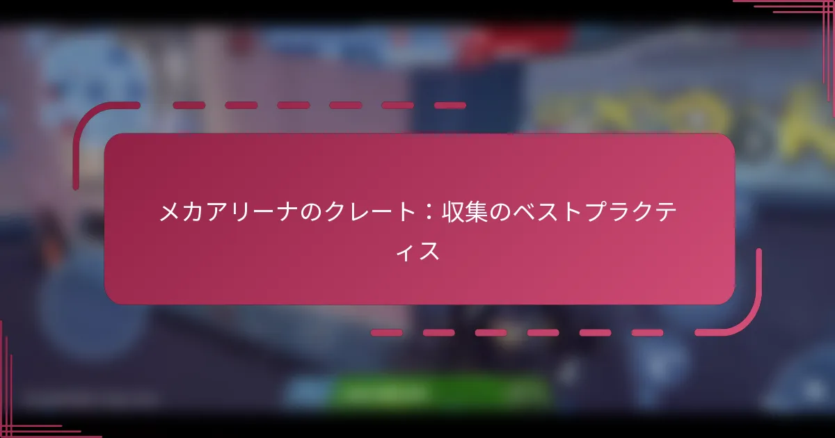 メカアリーナでは、プレイヤーは貴重な報酬や特典を提供するさまざまな種類のクレートを収集できます。ゲームプレイ体験を向上させるためには、クレート収集のベストプラクティスを理解することが重要です。これには、タイミング、高価値のクレートの優先順位付け、ゲーム内イベントの活用が含まれます。 メカアリーナのクレートの種類は何ですか? メカアリーナには、プレイヤーが収集できるいくつかの種類のクレートがあり、それぞれ異なる報酬や特典を提供します。これらのクレートを理解することは、ゲームプレイ体験と戦略を最大化するために不可欠です。 スタンダードクレートとその内容 スタンダードクレートは、メカアリーナで最も一般的なタイプです。これらは、マッチを完了したり、デイリーミッションを達成したりすることで獲得できます。これらのクレートには、通常、通貨、コンポーネント、時には低ティアの武器やメカが含まれています。 スタンダードクレートからの報酬は一般的に控えめですが、時間が経つにつれて蓄積され、プレイヤーにアップグレードに必要な基本的な材料を提供します。プレイヤーは、資源の安定供給を確保するために、これらのクレートを定期的に開けることを目指すべきです。 プレミアムクレートとその利点 プレミアムクレートは、スタンダードクレートと比較して強化された報酬を提供し、しばしば高ティアのコンポーネント、独占スキン、またはレア武器が含まれています。これらのクレートは、ゲーム内通貨または実際のお金で購入できるため、より大きな投資となります。 プレミアムクレートの利点には、全体的なゲームプレイを向上させる貴重なアイテムを取得するチャンスが高くなることが含まれます。メカを迅速に強化したいプレイヤーは、特に特別なプロモーションやイベント中に、これらのクレートに投資する価値があると感じるかもしれません。 イベント特化型クレートと期間限定オファー イベント特化型クレートは、特別なゲーム内イベント中に利用可能で、スタンダードクレートやプレミアムクレートにはないユニークな報酬が含まれています。これらのクレートには、独占スキン、テーマ付きコンポーネント、または期間限定の通貨ボーナスが含まれる場合があります。 イベントに参加し、これらのクレートを収集することで、ゲームプレイ体験を大幅に向上させることができます。プレイヤーは、これらの期間限定オファーを利用するために、今後のイベントに注目するべきです。これにより、レアアイテムを獲得するユニークな機会が得られます。 報酬に基づくクレートタイプの比較 異なる種類のクレートを比較する際には、提供される報酬の質と希少性を考慮することが重要です。以下は、クレートタイプの簡単な比較です: クレートタイプ 報酬の質 入手可能性 スタンダードクレート 低から中 一般的 プレミアムクレート 中から高 購入が必要 イベント特化型クレート さまざま(しばしば高) 期間限定 クレートタイプがゲームプレイに与える影響 どのタイプのクレートに焦点を当てるかは、ゲームプレイ戦略に大きな影響を与える可能性があります。スタンダードクレートは、資源の安定した供給を提供し、徐々にアップグレードするために重要です。しかし、それだけに頼ると進行が遅くなる可能性があります。 プレミアムクレートは、特に競技プレイを目指している場合、進行を加速させることができます。これらのクレートへの投資は、強力な武器やメカへの迅速なアクセスをもたらし、戦闘でのパフォーマンスを向上させます。 イベント特化型クレートは、期間限定のイベント中にユニークな利点を提供し、プレイヤーがゲームプレイのダイナミクスを変える独占アイテムを獲得できるようにします。イベントに積極的に参加することで、メカアリーナでの全体的な体験を向上させる重要な報酬を得ることができます。 プレイヤーはクレートからの報酬を最大化するにはどうすればよいですか? プレイヤーは、戦略的に収集のタイミングを計り、適切なゲームモードを選択し、ゲーム内イベントを活用し、努力の優先順位を付け、一般的なミスを避けることで、クレートからの報酬を最大化できます。これらの要素を理解することで、各クレートから得られる価値を大幅に向上させることができます。 クレート収集のためのタイミング戦略 タイミングは、効果的なクレート収集にとって重要です。プレイヤーは、ゲームが最も活発なピーク時にクレートを収集することを目指すべきです。これにより、より良い報酬を得られる可能性があります。また、クレート報酬を増加させる特定のゲーム内イベントを待つことも有益です。 数時間ごとにクレートの入手可能性を確認するためのリマインダーを設定することを検討してください。これにより、プレイヤーは期限が切れたり、時間が経つにつれて価値が下がったりする
