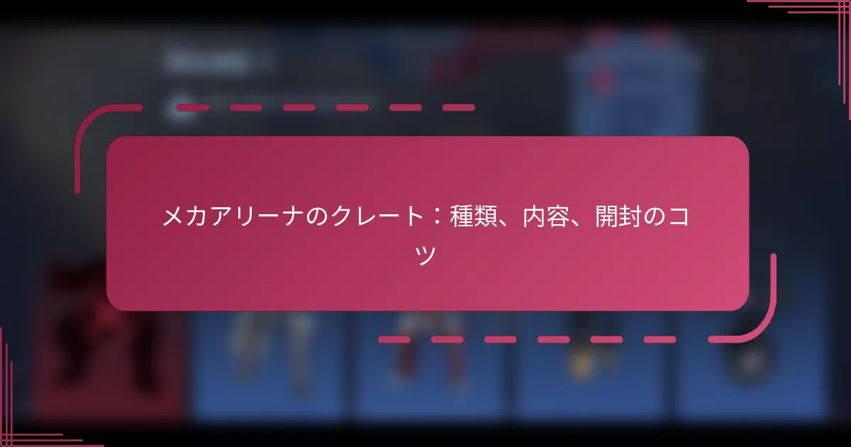 メカアリーナでは、プレイヤーはさまざまな種類のクレートに出会い、それぞれがゲームプレイに大きな影響を与える独自の報酬を提供します。一般的なクレートからレアなクレート、特別イベントのクレートまで、内容には武器、アップグレード、ゲーム内通貨が含まれることがあり、戦略的な選択が不可欠です。これらのクレートを開ける最適なタイミングやリソース管理を理解することで、全体的なゲーム体験を向上させ、貴重なアイテムを獲得することができます。 メカアリーナのクレートにはどのような種類がありますか? メカアリーナには、各種独自の報酬と利点を提供するいくつかの種類のクレートがあります。プレイヤーは、レア度や内容が異なる一般的なクレート、レアなクレート、特別イベントのクレートから選ぶことができ、これがゲームプレイや進行に影響を与えます。 一般的なクレートとその特徴 一般的なクレートは最も頻繁に遭遇するタイプで、通常は基本的な報酬が含まれています。これらのクレートには、低ランクの武器、コンポーネント、通貨が含まれることが多く、新しいプレイヤーにとってアクセスしやすいものです。 一般的なクレートからの報酬はゲームを変えるほどではありませんが、メカや武器のアップグレードに必要な基本的なリソースを提供します。プレイヤーは、時間をかけてリソースを蓄積するために、これらのクレートを定期的に開けることができます。 一般的なクレートは、ゲームプレイを通じて、ミッションをクリアすることで、またはデイリーログインボーナスとして入手でき、基本アイテムの安定した供給を確保します。 レアなクレートとその独自の特徴 レアなクレートは、一般的なクレートよりもはるかに良い報酬を提供し、高ランクの武器や独占的なコンポーネントが含まれています。これらのクレートは、より強力な装備でゲームプレイ体験を向上させたいプレイヤーのために設計されています。 レアなクレートを開けることで、一般的なクレートにはない特別なスキンや強化された武器などのユニークなアイテムが得られることがあります。プレイヤーは、レアなクレートを獲得または購入するために時間を投資することで、ゲームプレイの改善につながることが多いと感じています。 レアなクレートは、特別イベント、実績、またはゲーム内通貨を使って入手でき、メカをより迅速に進めたいプレイヤーにとって貴重なターゲットとなります。 特別イベントのクレートと期間限定オファー 特別イベントのクレートは、期間限定のプロモーション中に利用可能で、通常は独占的なアイテムやテーマに沿った報酬が含まれています。これらのクレートは、ゲーム内イベント、祝日、または季節のアップデートに合わせて設計されています。 プレイヤーは、特別イベントのクレートの内容には、レアなスキン、ユニークな武器、または他の時期には入手できない新しいメカタイプが含まれる可能性があるため、これらのイベントに注意を払うべきです。これにより、非常に人気があります。 特別イベントのクレートからの利益を最大化するために、プレイヤーはイベントに積極的に参加し、関連するチャレンジをクリアしてこれらの期間限定の報酬を獲得する必要があります。 レア度と報酬によるクレートタイプの比較 クレートタイプ レア度 典型的な内容 一般的なクレート 低 基本的な武器、コンポーネント、通貨 レアなクレート 中 高ランクの武器、独占的なコンポーネント 特別イベントのクレート 高 独占的なアイテム、テーマに沿った報酬 この比較は、クレートタイプ間のレア度と潜在的な報酬の違いを強調しています。プレイヤーは、より良いアップグレードとユニークなアイテムのために、レアなクレートと特別イベントのクレートを優先するべきです。 クレートタイプがゲームプレイ体験に与える影響 開けるクレートのタイプは、メカアリーナにおけるプレイヤーの体験に大きな影響を与える可能性があります。一般的なクレートは基盤となるリソースを提供し、レアなクレートは優れた装備でプレイヤーの競争力を高めることができます。 特別イベントのクレートは、ユニークなアイテムを通じて新しい戦略やゲームプレイスタイルを導入し、プレイヤーが適応し、さまざまなアプローチを探求することを促します。この多様性は、ゲームを魅力的でダイナミックに保ちます。 プレイヤーは、戦闘で競争力を維持するために高ランクのクレートを取得することに戦略的に焦点を当てるべきです。装備の質は、試合でのパフォーマンスに直接影響を与えます。 プレイヤーはメカアリーナのクレートでどのような内容を見つけることができますか? メカアリーナのクレートには、武器、アップグレード、ゲーム内通貨など、ゲームプレイを向上させるさまざまな貴重なアイテムが含まれています。プレイヤーは、潜在的な報酬とゲーム内での現在