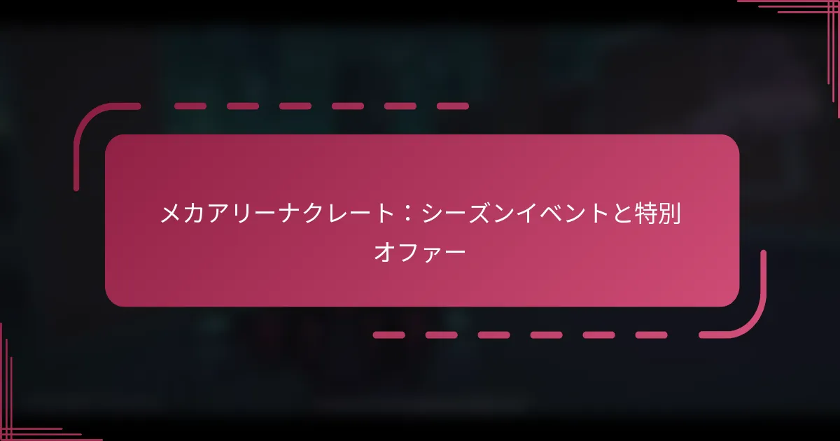 メカアリーナでは、プレイヤーは貴重な報酬や特典を提供するさまざまな種類のクレートを収集できます。ゲームプレイ体験を向上させるためには、クレート収集のベストプラクティスを理解することが重要です。これには、タイミング、高価値のクレートの優先順位付け、ゲーム内イベントの活用が含まれます。 メカアリーナのクレートの種類は何ですか? メカアリーナには、プレイヤーが収集できるいくつかの種類のクレートがあり、それぞれ異なる報酬や特典を提供します。これらのクレートを理解することは、ゲームプレイ体験と戦略を最大化するために不可欠です。 スタンダードクレートとその内容 スタンダードクレートは、メカアリーナで最も一般的なタイプです。これらは、マッチを完了したり、デイリーミッションを達成したりすることで獲得できます。これらのクレートには、通常、通貨、コンポーネント、時には低ティアの武器やメカが含まれています。 スタンダードクレートからの報酬は一般的に控えめですが、時間が経つにつれて蓄積され、プレイヤーにアップグレードに必要な基本的な材料を提供します。プレイヤーは、資源の安定供給を確保するために、これらのクレートを定期的に開けることを目指すべきです。 プレミアムクレートとその利点 プレミアムクレートは、スタンダードクレートと比較して強化された報酬を提供し、しばしば高ティアのコンポーネント、独占スキン、またはレア武器が含まれています。これらのクレートは、ゲーム内通貨または実際のお金で購入できるため、より大きな投資となります。 プレミアムクレートの利点には、全体的なゲームプレイを向上させる貴重なアイテムを取得するチャンスが高くなることが含まれます。メカを迅速に強化したいプレイヤーは、特に特別なプロモーションやイベント中に、これらのクレートに投資する価値があると感じるかもしれません。 イベント特化型クレートと期間限定オファー イベント特化型クレートは、特別なゲーム内イベント中に利用可能で、スタンダードクレートやプレミアムクレートにはないユニークな報酬が含まれています。これらのクレートには、独占スキン、テーマ付きコンポーネント、または期間限定の通貨ボーナスが含まれる場合があります。 イベントに参加し、これらのクレートを収集することで、ゲームプレイ体験を大幅に向上させることができます。プレイヤーは、これらの期間限定オファーを利用するために、今後のイベントに注目するべきです。これにより、レアアイテムを獲得するユニークな機会が得られます。 報酬に基づくクレートタイプの比較 異なる種類のクレートを比較する際には、提供される報酬の質と希少性を考慮することが重要です。以下は、クレートタイプの簡単な比較です: クレートタイプ 報酬の質 入手可能性 スタンダードクレート 低から中 一般的 プレミアムクレート 中から高 購入が必要 イベント特化型クレート さまざま(しばしば高) 期間限定 クレートタイプがゲームプレイに与える影響 どのタイプのクレートに焦点を当てるかは、ゲームプレイ戦略に大きな影響を与える可能性があります。スタンダードクレートは、資源の安定した供給を提供し、徐々にアップグレードするために重要です。しかし、それだけに頼ると進行が遅くなる可能性があります。 プレミアムクレートは、特に競技プレイを目指している場合、進行を加速させることができます。これらのクレートへの投資は、強力な武器やメカへの迅速なアクセスをもたらし、戦闘でのパフォーマンスを向上させます。 イベント特化型クレートは、期間限定のイベント中にユニークな利点を提供し、プレイヤーがゲームプレイのダイナミクスを変える独占アイテムを獲得できるようにします。イベントに積極的に参加することで、メカアリーナでの全体的な体験を向上させる重要な報酬を得ることができます。 プレイヤーはクレートからの報酬を最大化するにはどうすればよいですか? プレイヤーは、戦略的に収集のタイミングを計り、適切なゲームモードを選択し、ゲーム内イベントを活用し、努力の優先順位を付け、一般的なミスを避けることで、クレートからの報酬を最大化できます。これらの要素を理解することで、各クレートから得られる価値を大幅に向上させることができます。 クレート収集のためのタイミング戦略 タイミングは、効果的なクレート収集にとって重要です。プレイヤーは、ゲームが最も活発なピーク時にクレートを収集することを目指すべきです。これにより、より良い報酬を得られる可能性があります。また、クレート報酬を増加させる特定のゲーム内イベントを待つことも有益です。 数時間ごとにクレートの入手可能性を確認するためのリマインダーを設定することを検討してください。これにより、プレイヤーは期限が切れたり、時間が経つにつれて価値が下がったりする
